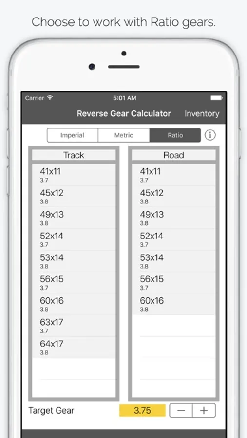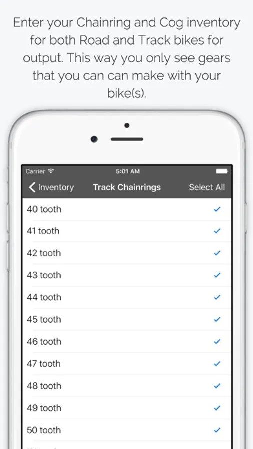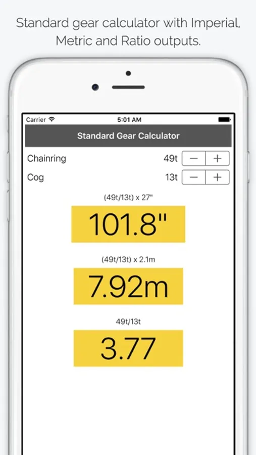 The app also has a standard gear calculator function where one enters chainring and cog combinations and the app outputs gear-inches, gear-meters, and gear ratio.