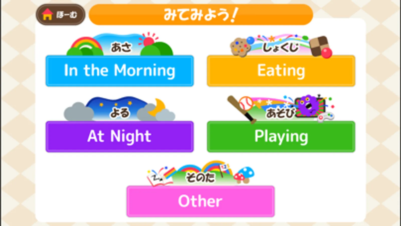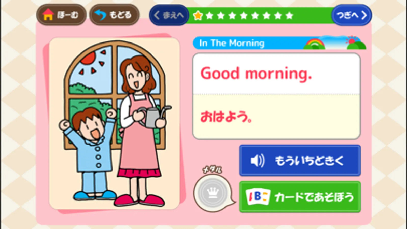 自然に英語を聞く力を身に付けるために、また、子どもたちが飽きないように、遊びの要素を盛り込み、目と耳から繰り返し学習できるアプリです。