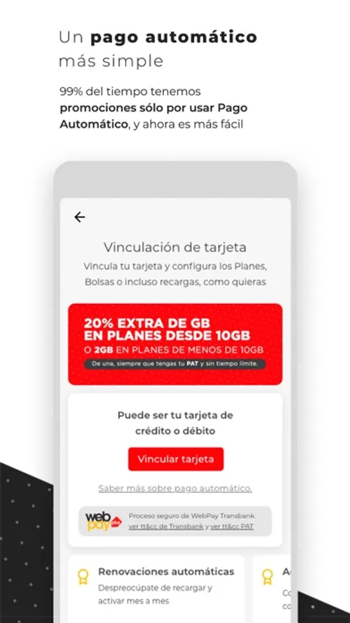 - Suscribir tu Plan Sin Contrato o bolsa a Pago Automático más fácil. Vincula tu tarjeta y luego configura tu PAT en un par de pasos, olvídate de pagar mes a mes y obtén distintas promociones adicionales