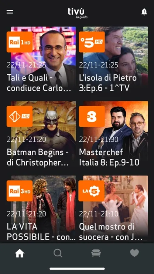 tivù la guida è anche la prima e unica guida tv in cui i palinsesti e le visualizzazioni si adattano alle tue preferenze. Registrati per creare il tuo palinsesto e personalizzare la homepage: oltre ai programmi Da non perdere scelti per te dalla nostra redazione, a quelli ora in onda e di prima serata, potrai consultare anche film e serie tv, richiamare velocemente i palinsesti dei tuoi canali preferiti e lanciare velocemente le dirette Tv disponibili attivando il widget Guarda in Diretta.
