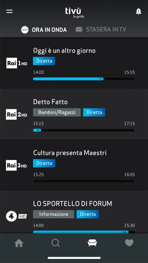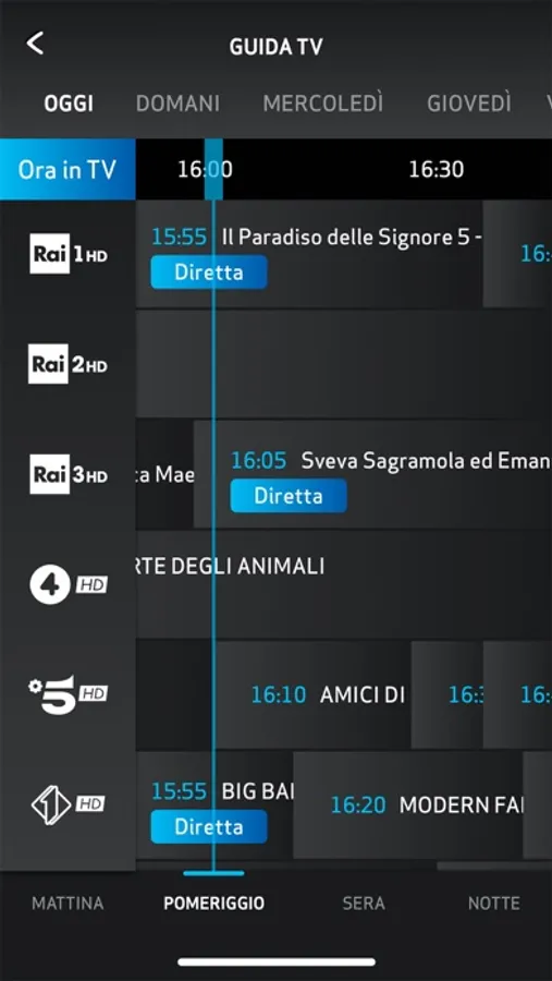 Puoi vedere la programmazione TV in tanti modi diversi: dal palinsesto verticale di ciascun canale alla griglia “Guida TV” per un veloce sguardo d’insieme, dai programmi Ora in onda a quelli di prima serata. L’app ti offre anche la possibilità di vedere la diretta TV di un programma, lanciando direttamente lo streaming del canale selezionato.