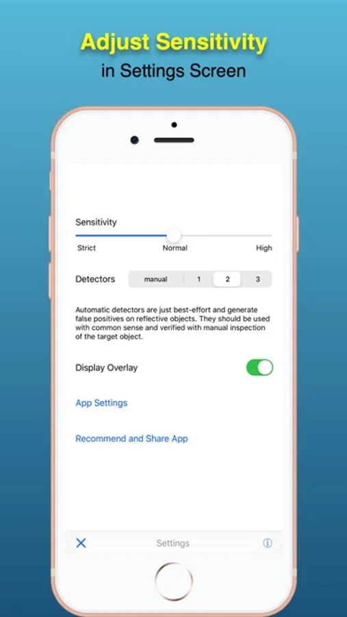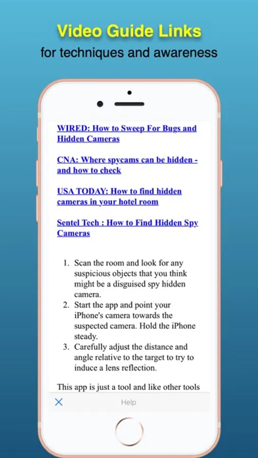This app is a tool to help you detect disguised camera lens that you suspect are present in a room. The manual mode with overlay is already equivalent to the do-it-yourself described above or the more expensive hardware camera detector gadgets that tries to detect using the tell-tale signs of tiny reflections of hidden camera lenses. The good thing is this app is always with you, ready when you need it.