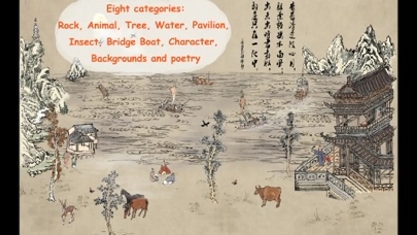 ink painting works.Elements are classified into eight kinds :"Rock, Animal, Tree, Water, Pavilion, Insect, Bridge Boat, Character, Backgrounds and poetry".