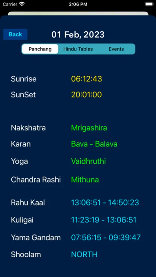 - Shubha/Ashubha kaal like Rahu kaal,Yama Gandom,Kuligai,Shoolam Direction.