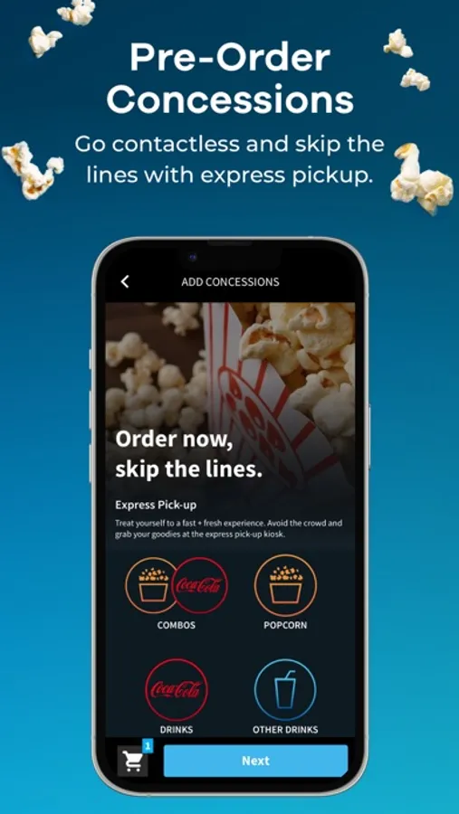 • PRE-ORDER CONCESSIONS: Add your favorite snacks to your order & pick them up at an express lane (at participating locations).