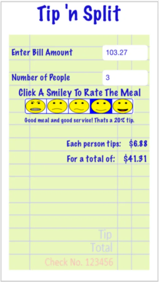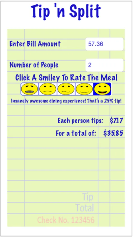 Super simple tip calculator! Enter the bill amount, enter the number of people splitting the bill, rate the service, and that's it; Tip 'n Split will do the rest! With Tip 'n Split you will never have to think about percentages. The tip is calculated based on how happy you are with the meal.