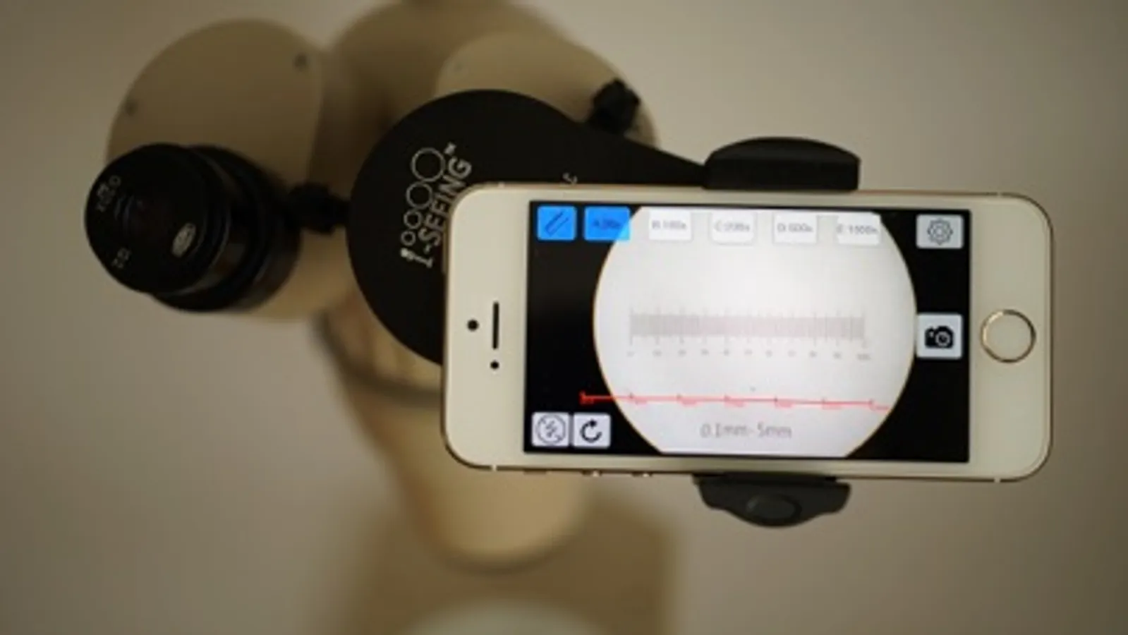 Attach your phone with iADAPTER to your microscope and convert it into a digital microscope with i-Scale. It enables you to take digital micrographs with scale-bar embedded and remarks added. In addition, you can easily share micrographs with other and people.