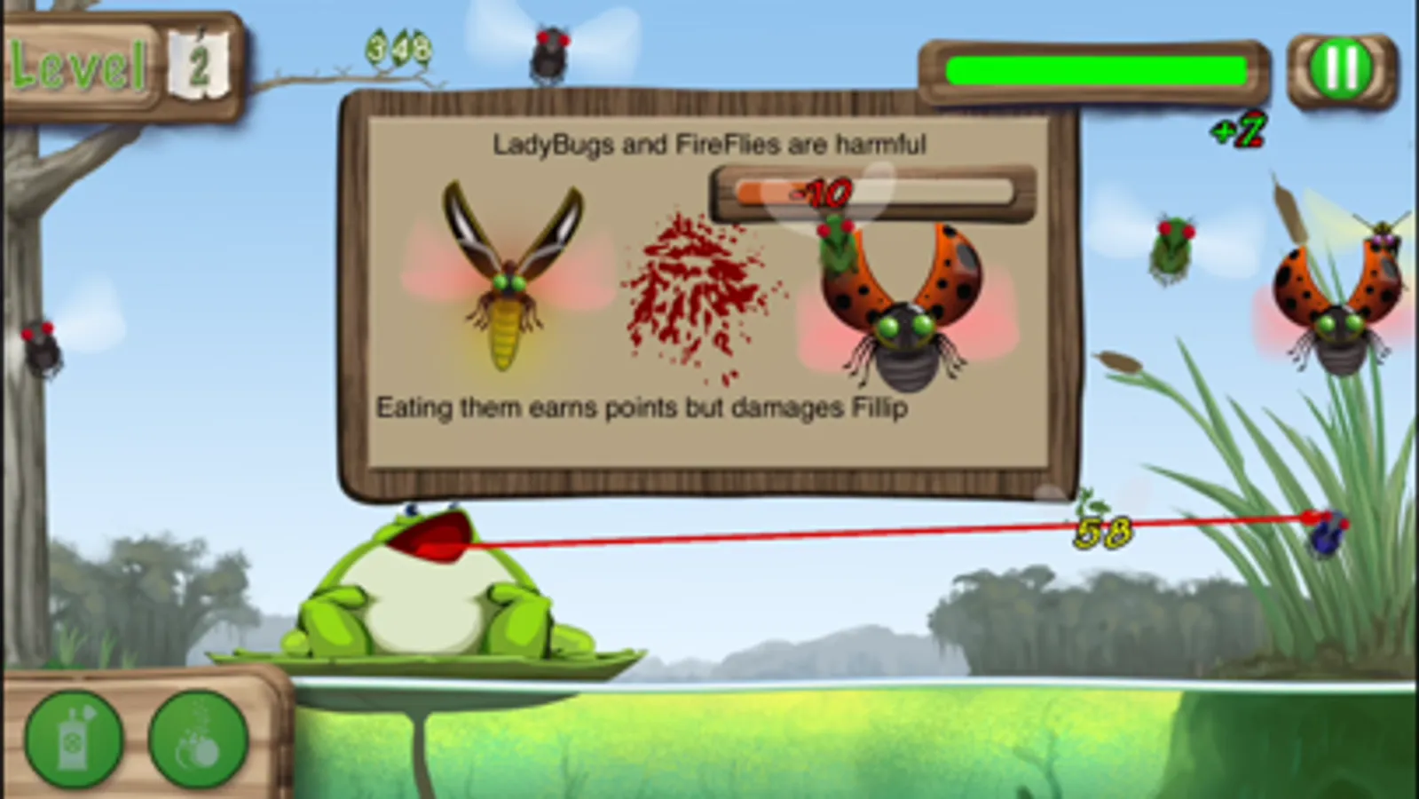 In the swamp with Fillip, finding food is a most excellent adventure. Using his most swiftly flicking tongue, Fillip catches the colorful flies zipping around the swamp to fill his belly. Warning, surviving in the swamp is not as easy as it appears. Fillip must flick his tongue carefully around the ladybugs by day and the fireflies by night. Cause, if he eats them, these bugs cause damage to his health. Then of course, native to any swamp are those pesky mosquitoes, always ready to bite you. Take the challenge, with Fillip's Feast, a fun and engaging game for all.