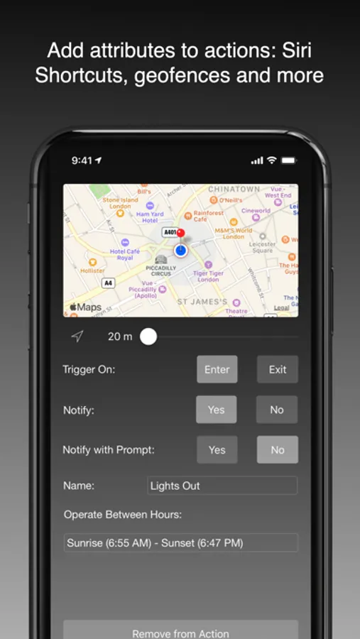 You can add attributes to any action, such as location triggering with beacons or geofences, schedules, even voice recognition.