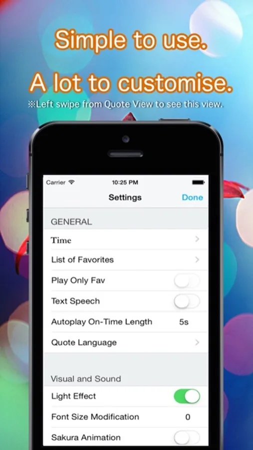 As a small gift to users, we prepared a sakura animation. Go to the Settings page and turn the feature on, go back to the Quotes page, and let the sakura fall gently down your screen. True, it might block your view a little. But I think it is sometimes nice to feel the nature while reading inspirational quotes.