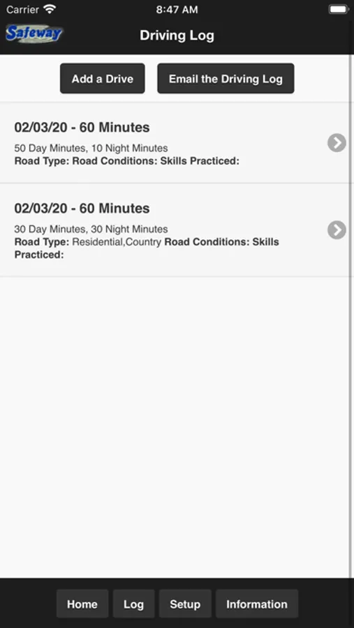 At any time you can email to yourself a pdf of the driving log in the State-approved format that can be printed, signed and submitted at your Road Test. There is no need for a hand-written log on the side of the refrigerator. Keep track of your 50 hours on your phone and let the app generate your log for you!