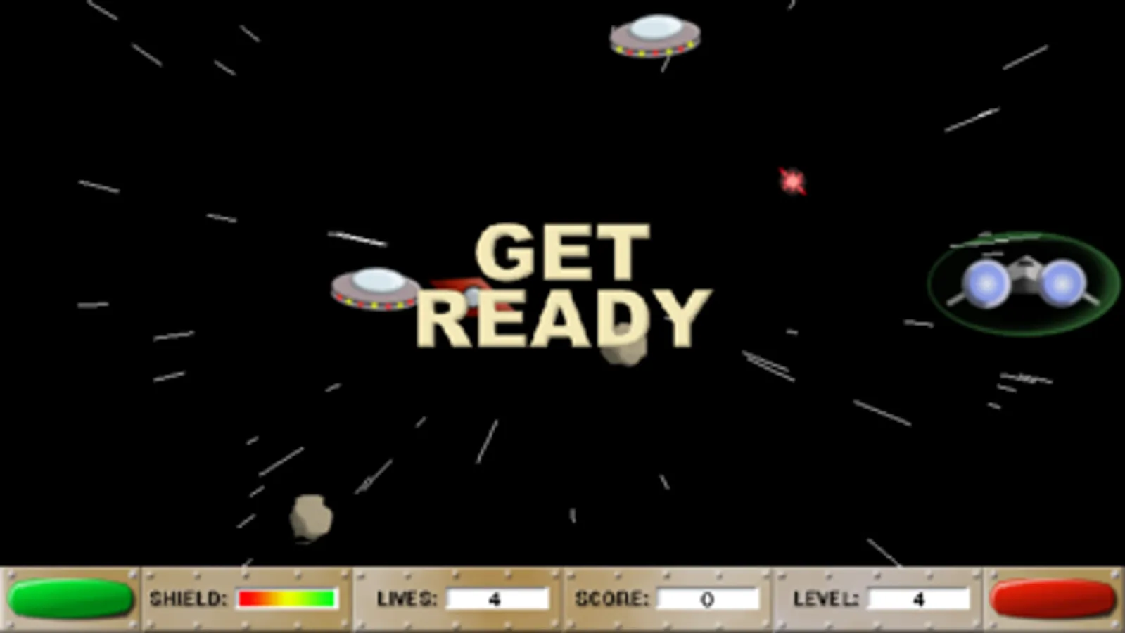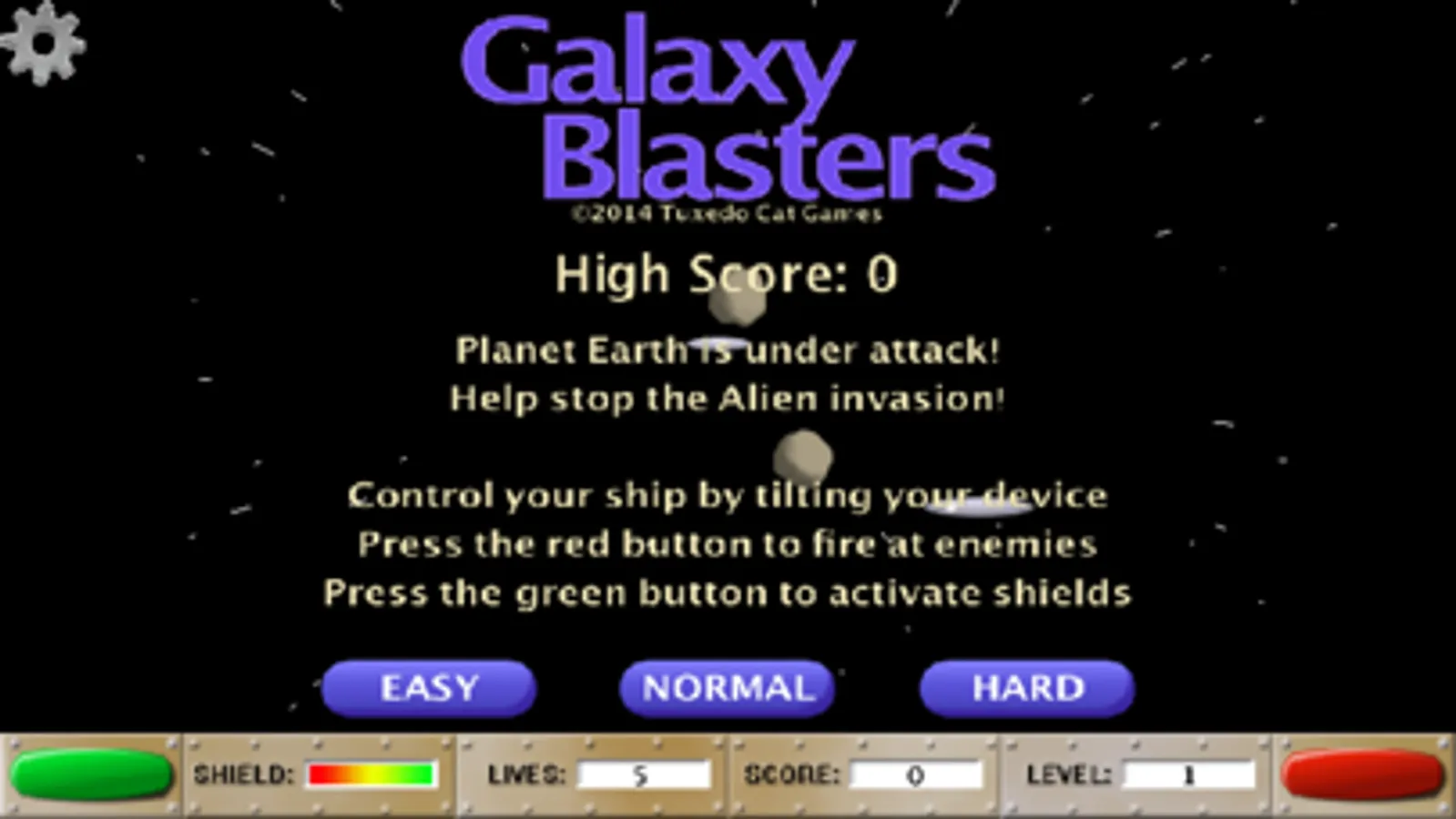 Galaxy Blaster is an arcade style, space shooter. You control your ship by tilting your device in the direction you want your ship to move (don't try "steering" like a racing game). Press the red button to shoot the enemies and the green button to activate your shields. Shields have a limited, recharging power supply, so keep an eye on the meter.