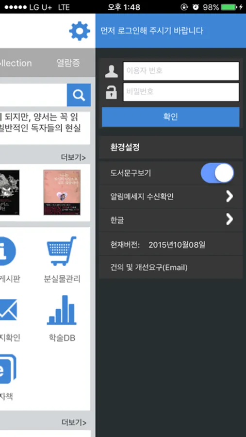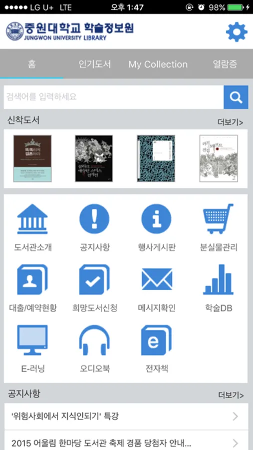 중원대학교 학술정보센터는 모바일 앱(APP)을 개발함으로써 iOS를 통한 서비스를 제공하게 되었습니다. 앱(App)을 통해 도서관소개, 이용안내, 통합검색, 대출조회 및 연기신청, 예약 등 도서관에서 제공되는 모든 서비스를 이용할 수 있습니다.