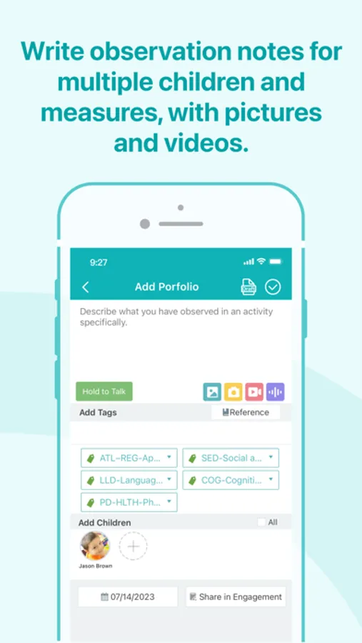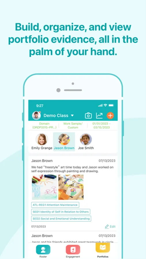 1. Use portfolio tags to track and organize children’s developmental observations and assessment evidence. While Learning Genie includes a variety of Early Learning Standards across 50 states in the U.S. and around the world, we can also provide customization for your school’s assessment framework. The portfolio dashboard also helps educators track their progress toward completing assessments.