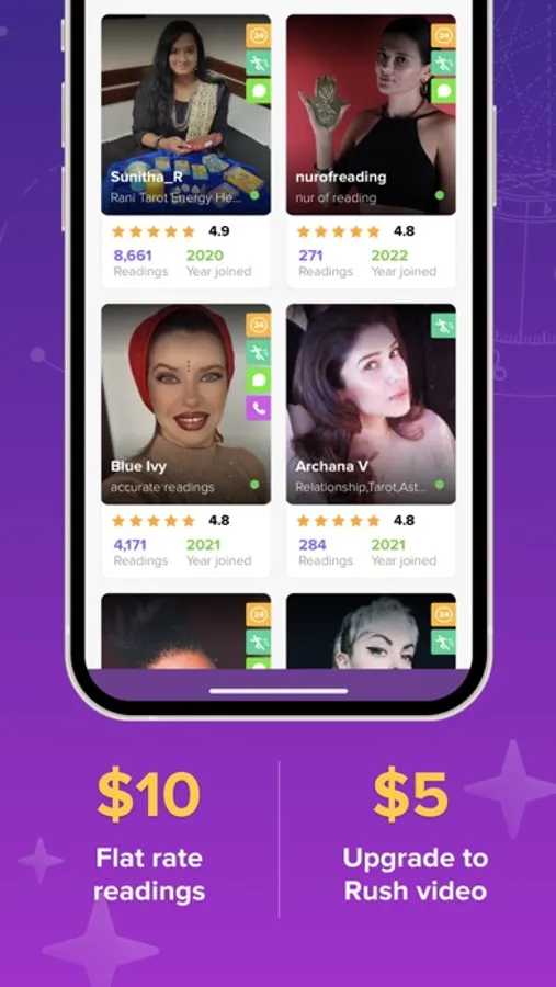 - Search by specialty such as; tarot readings, psychic readings, love readings, palm readings, astrology and horoscopes, oracle readings, dream analysis, and angel insights.