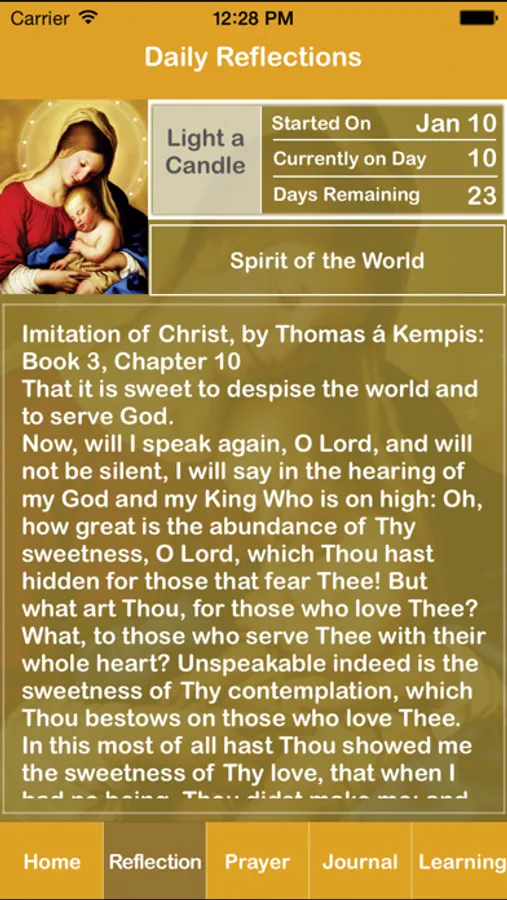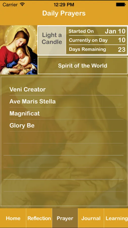 During the 33 day retreat, users are invited to light a candle offering for a personal intention or for a special cause. The lit candle will burn for 9 days, during which time the user can share the lit candle and prayer with the person they are praying for, to encourage them and let them know that they are being prayed for. The candle once lit will also appear on the world candles view, where the user can receive prayers from other users or can tap a candle and pray for someone else - as a sign of our Christian unity, as the body of Christ.