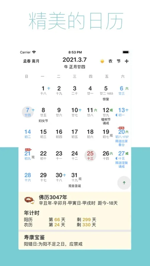 1. Exquisite and meticulous calendar, including national festivals, lunar festivals, solar terms, Buddhist festivals. The calendar uses double day layout, so that you will not mistake every festival. The calendar is equipped with push to remind Buddha and Bodhisattva festivals, ten (6) Ramadan, Guanyin Ramadan, legal holidays and other information.