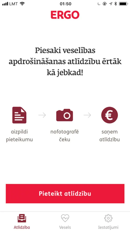 Ar atjaunoto ERGO mobilo aplikāciju, veselības apdrošināšanas atlīdzības pieteikšana ir kļuvusi vēl ātrāka un ērtāka. Lai pieteiktu atlīdzību, norādi veselības apdrošināšanas kartes informāciju un nofotografē medicīnas izdevumu dokumentus ar tālruņa foto kameru.
