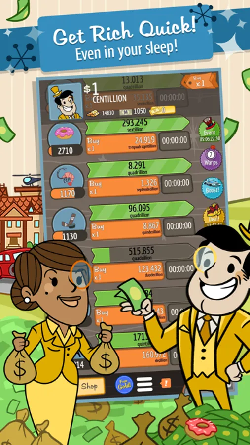 Catch up to or pull ahead of competition, Investor, by visiting the store: Purchase more Gold, Time Warps, or specific Managers to help boost your finances. Your one stop shop for everything a fancy Investor could ever want while building an exorbitantly wealthy empire
