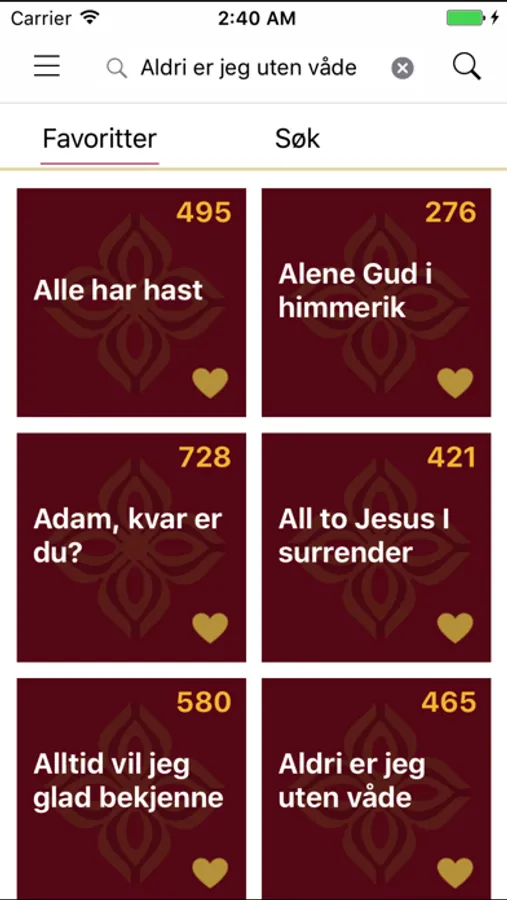 The App can be used without subscription to search within all the hymns in Norsk salmebok 2013, and add hymns to favorite lists.