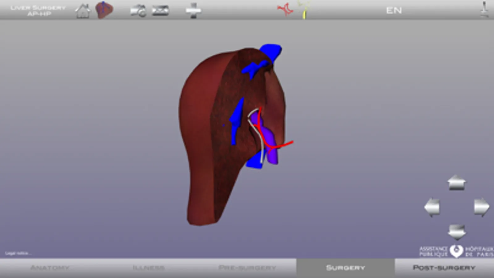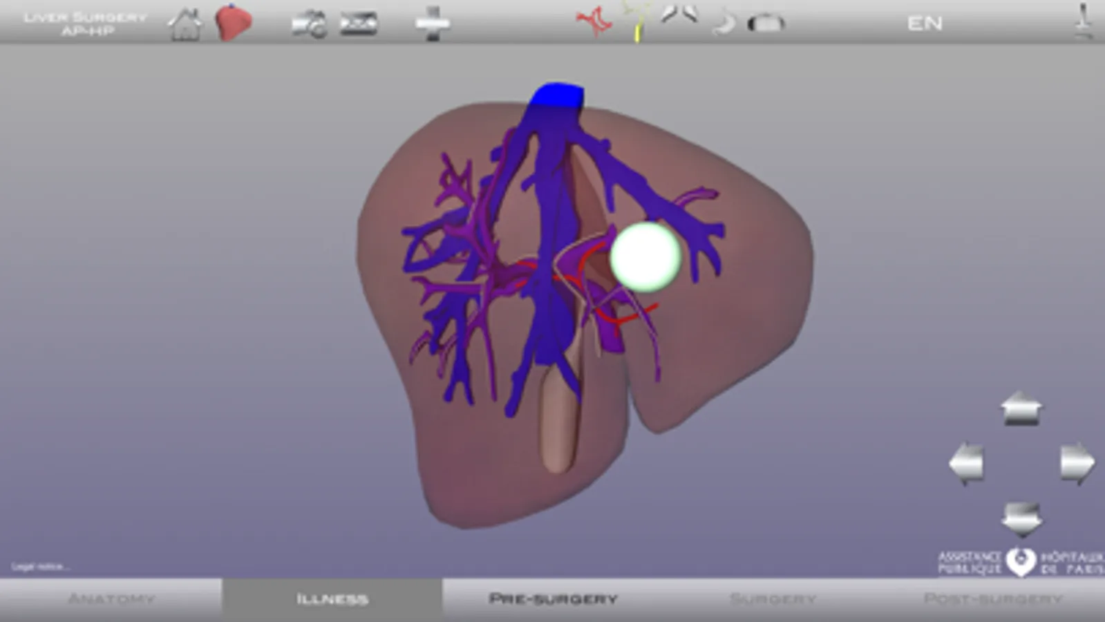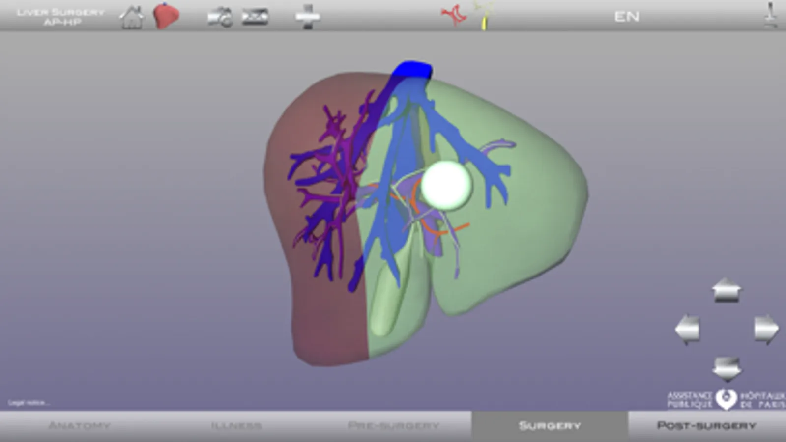 Liver Surgery AP-HP contains a 3D model of the external and internal structure of a healthy liver, easily movable in all axes in real time. The anatomy of the patient is created by modifying a model liver anatomy and the pathology is perfectly modeled in its location and volume.