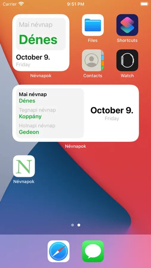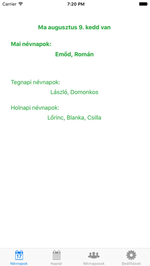 - Alkalmazás: Az alkalmazást indítva az aktuális nap dátumát, és a névnapokat lehet látni.