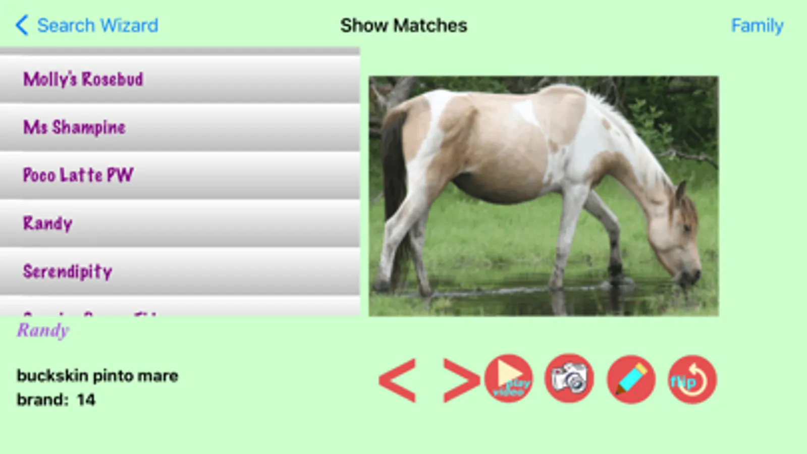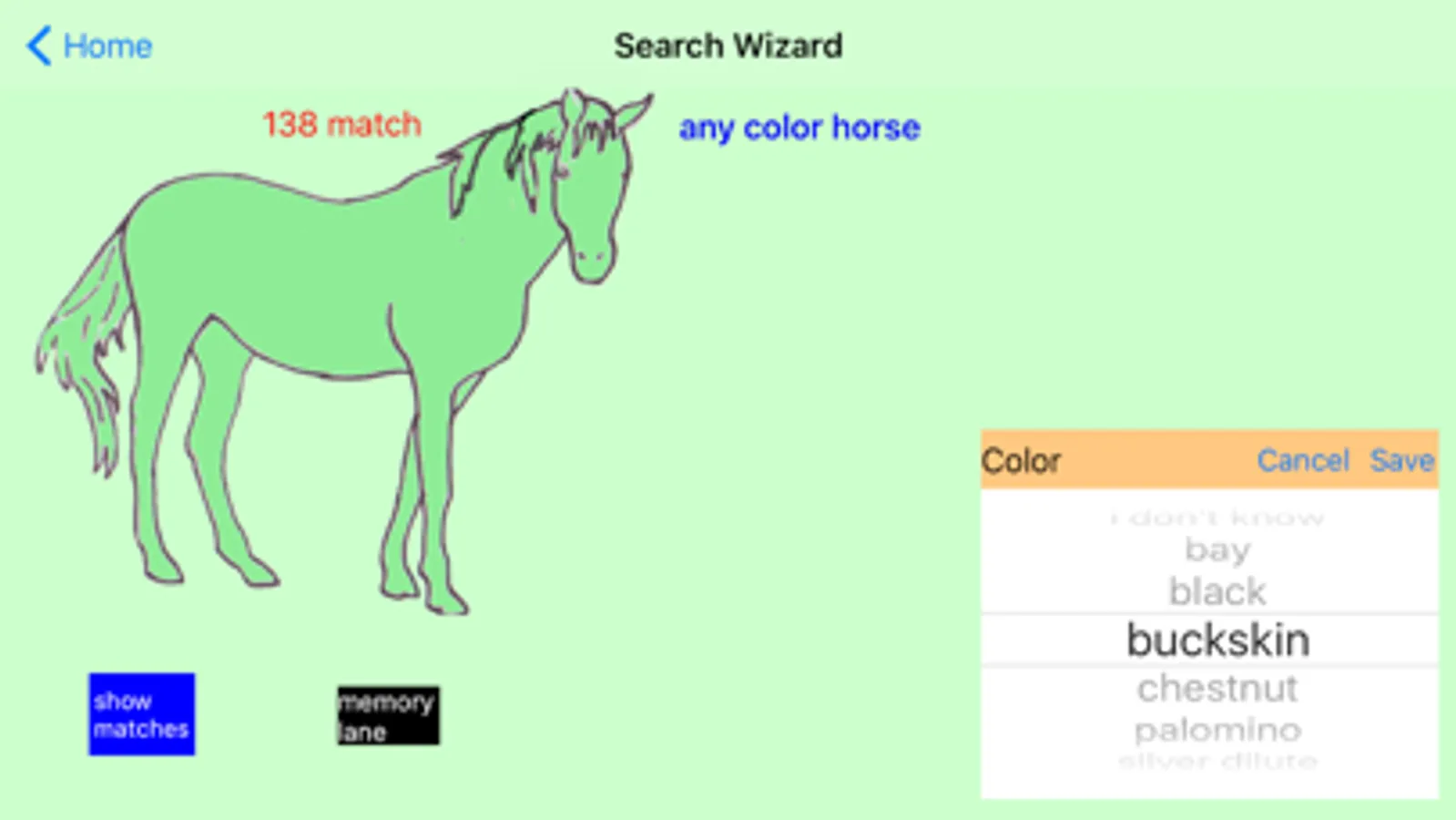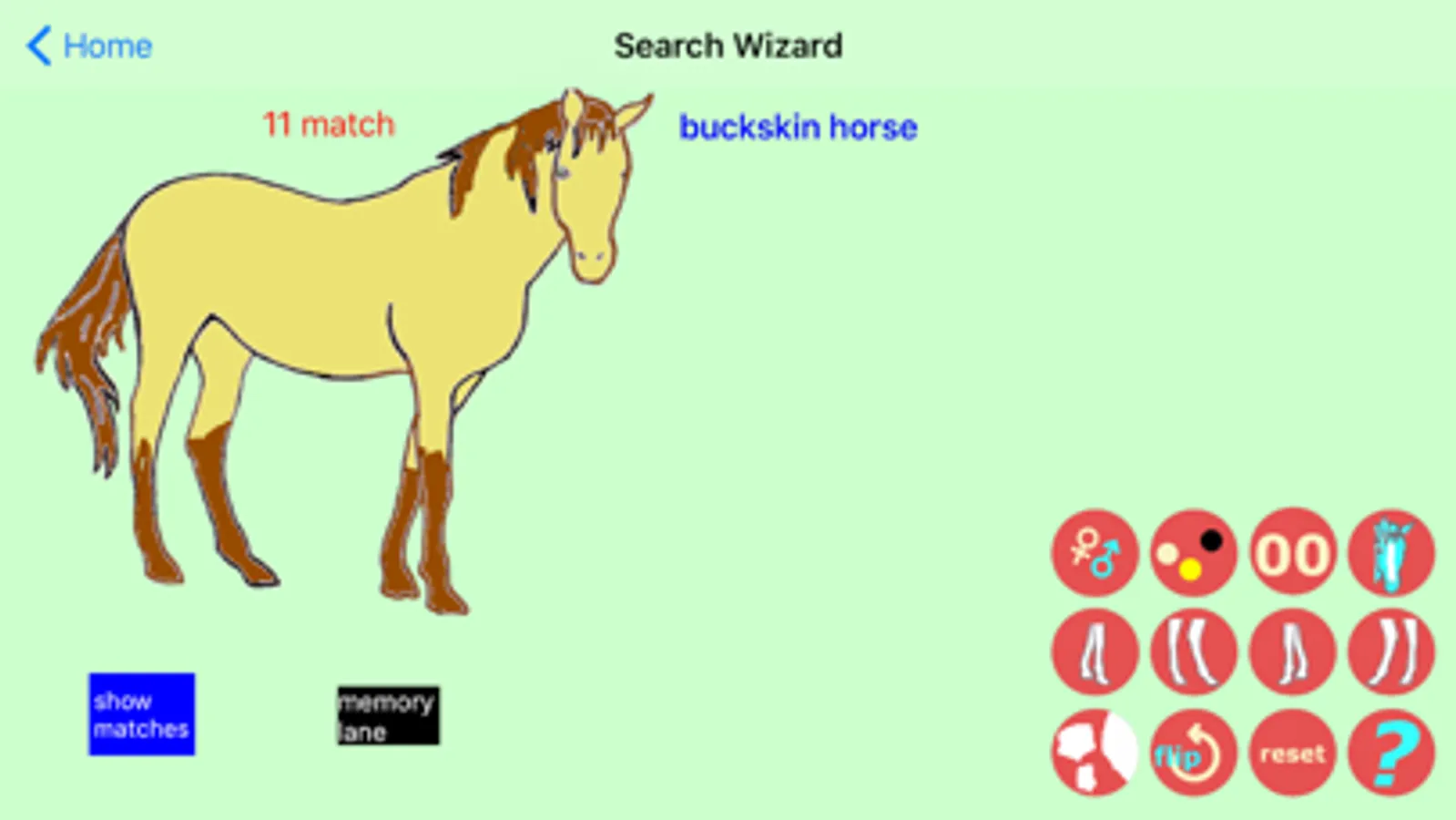 A simple search wizard allows you to narrow the list of possibilities using options that include gender, color, brand, face markings, leg markings, and pinto markings. Simply press a button and select an option from a list.