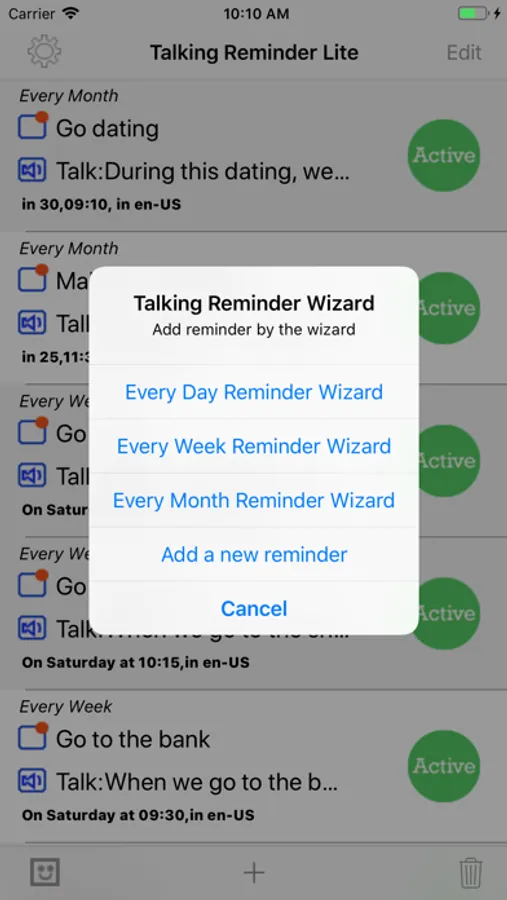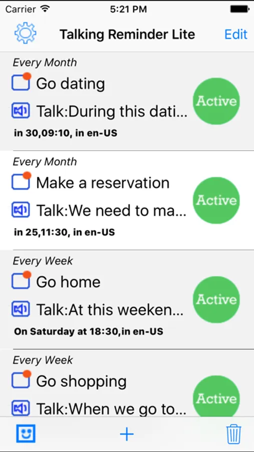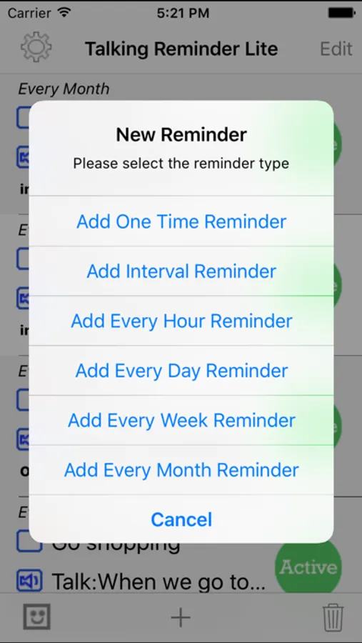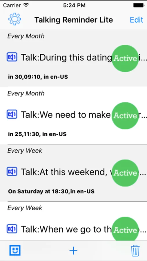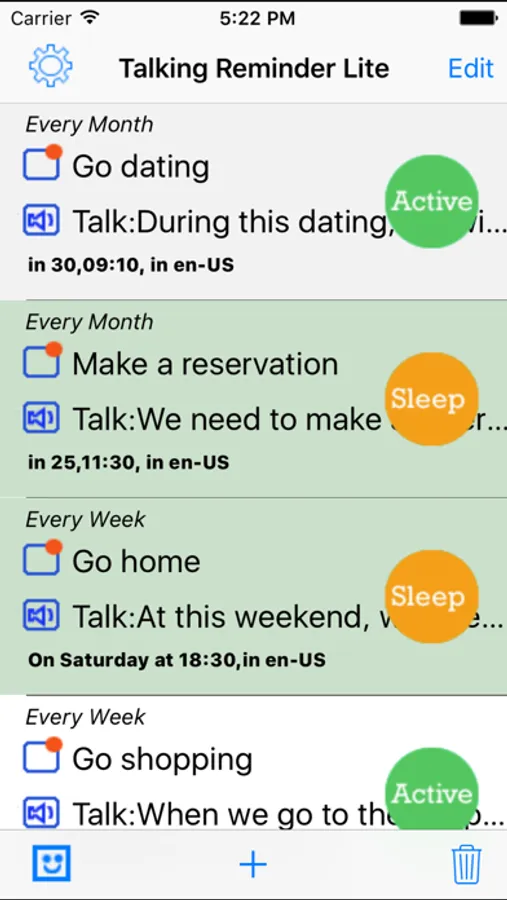 Screen shots description: in the screen shot, if there are only one main title line in each cell , the notification sound is the default iOS sound and only the talking text is displayed. If there are two main title lines in each cell of the main list view, one line is for the talking notification sound. the other line is for the talking text. In the main list view, if we tap the + button at the bottom tool bar, the menu list is displayed. From this menu, the user could select the reminder type. In the main list view, if one reminder event cell is displayed, and we tap the active button, the status of the event will be changed to sleep status.