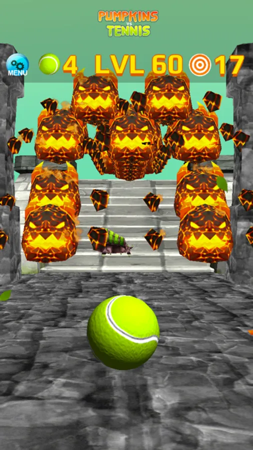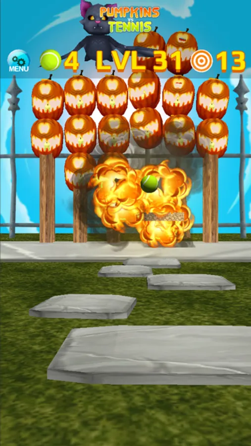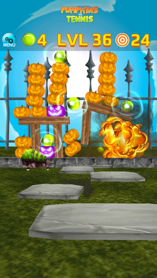 There are 60 levels to conquer with various pumpkins, including exploding pumpkins, and angry flying pumpkin monsters in formations. Since you have a limited number of tennis ball on each levels to destroy all the pumpkins, and many levels require some thinking, try to hit all the pumpkins with the least amount of throws. Earn star ratings if you hit all the pumpkins and the bonus goals.