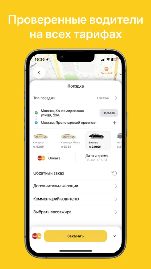 • Возможна привязка банковской карты в приложении для последующей оплаты поездки.
