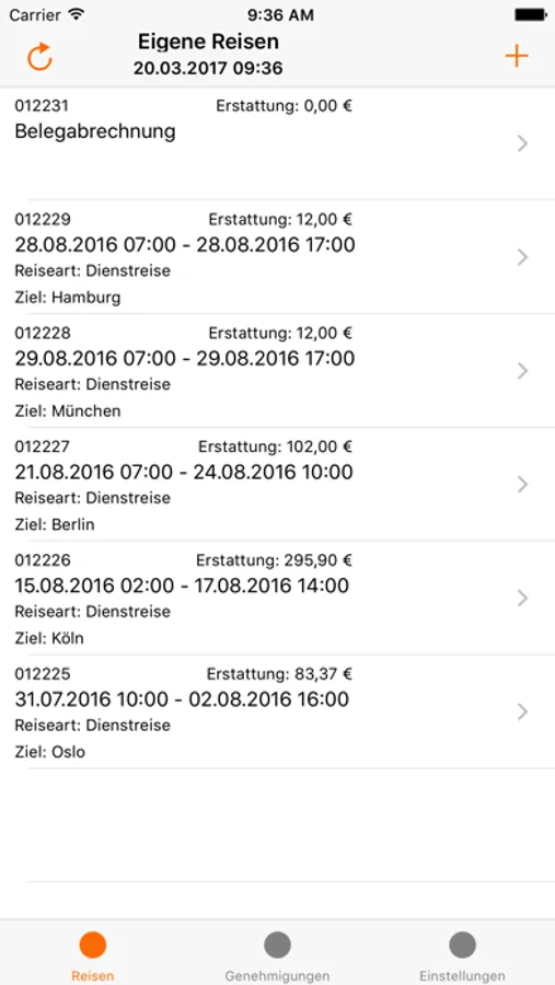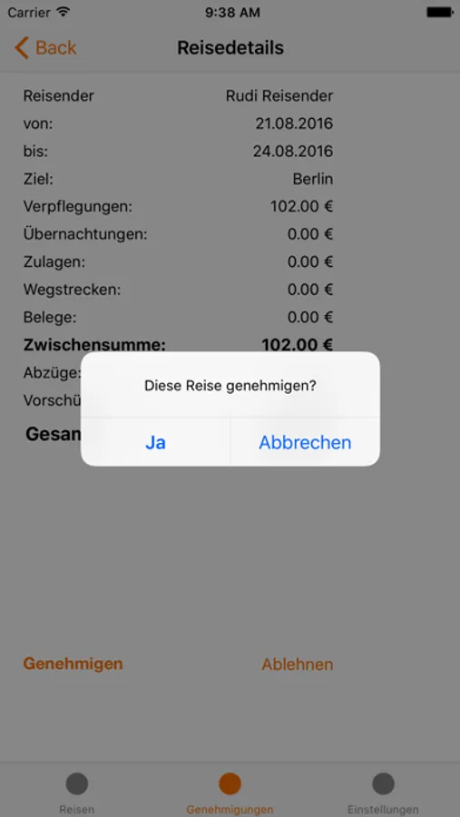 Berechtigte Nutzer können Reiseanträge (vor der Reise) und Reisekostenabrechnungen (nach der Reise) via App schnell und komfortabel genehmigen. Der Genehmiger sieht sofort die wichtigsten Reisedaten und kann den Antrag mit einem Klick genehmigen oder auch ablehnen.
