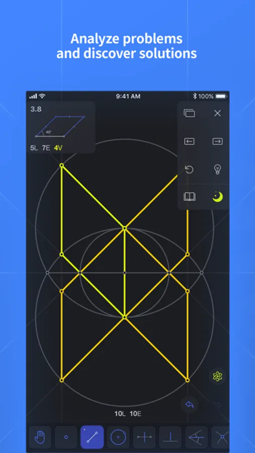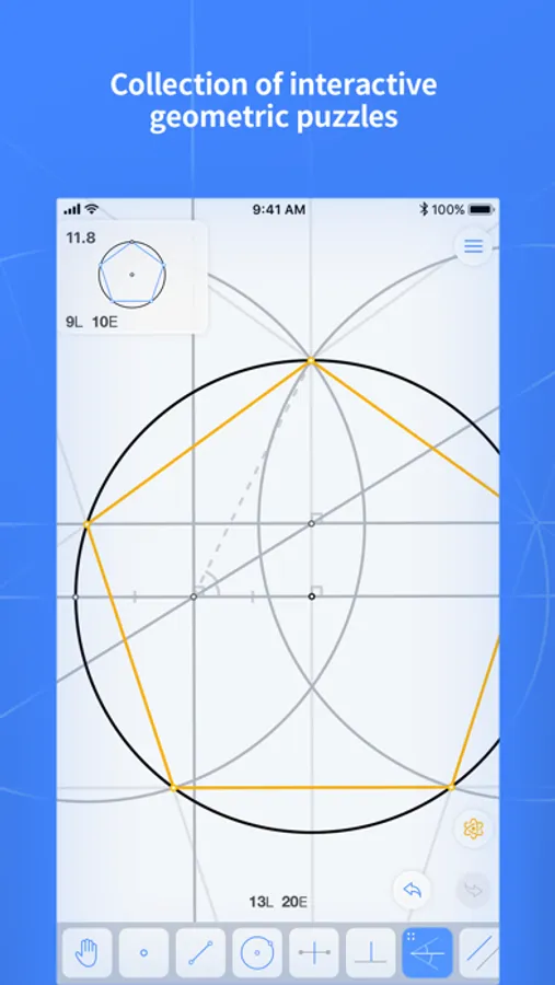 Euclidea-created constructions are completely dynamic. As such, you can drag to adjust angles, lines, radii and so on. You can also easily zoom and pan. This not only makes the experience more interactive, but it allows you to more deeply grasp the relationships between geometric elements, explore various possibilities, and analyze errors.