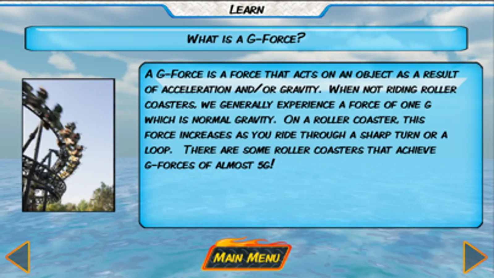 The game features stunning 3D graphics, colorful scenery and a powerful 3D physics simulator. Take a break from the game to visit the learning section where you can learn about centripetal force, G-forces and why roller coaster loops are teardrop shaped instead of circular.