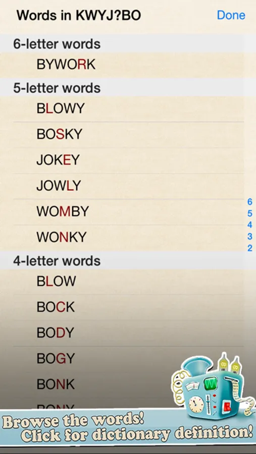 Click on a word on the results screen for a definition of that word using the built-in dictionary.