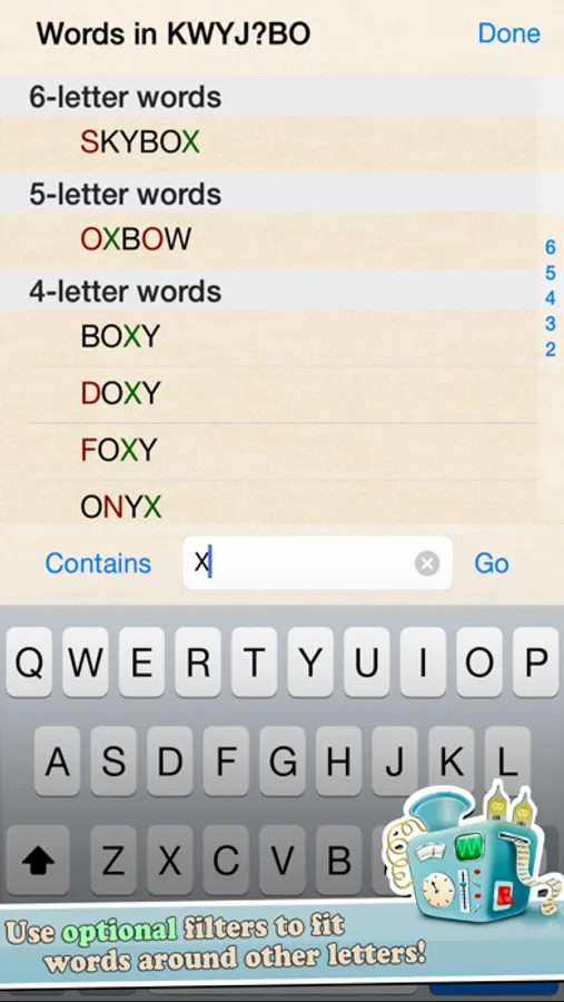 - Optional additive filters for fitting words around pre-existing letters on a game-board.