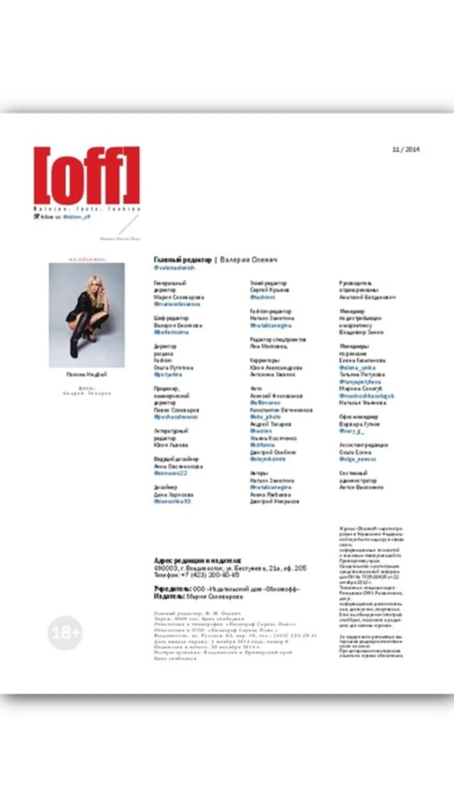 Журнал [off] удерживает баланс между актуальным и вечным, освещая в равной степени стиль, фитнес, карьеру, отношения, экономику и является, помимо путеводителя по красивой жизни, также и авторитетным общественно-политическим изданием города.
