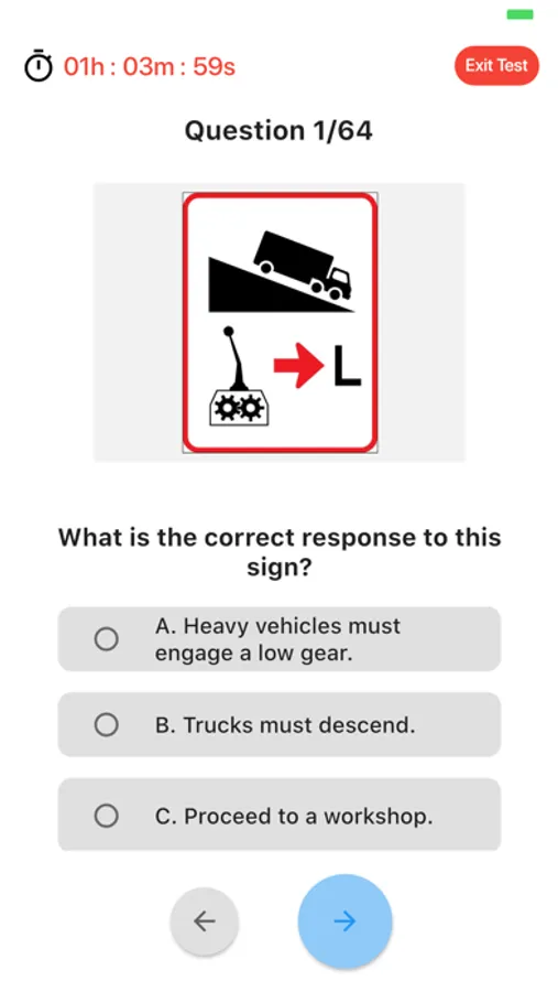 The app includes 255 multiple-choice questions similar to those asked in the official learner’s test. Questions cover vehicle controls, rules of the road and road signs – and are randomized each time you take the test. Review your answers and see whether you are prepared for the official test or whether you need to revise some more!