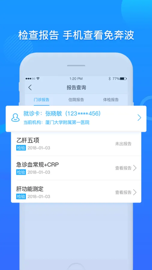 厦门大学附属第一医院以患者为中心推出了即时问诊、电话咨询、图文咨询的医疗服务内容。患者可通过视频、语音、图文的方式,随时随地接受医生的诊疗服务。互联网医院为医生打通了线上和线下的业务系统,诊疗过程中可为患者在线开具检查、检验单,给出健康指导意见。 我们坚信未来医疗健康将突破现有思维束缚,以人为本,为广大患者创造越来越好的就医体验。
