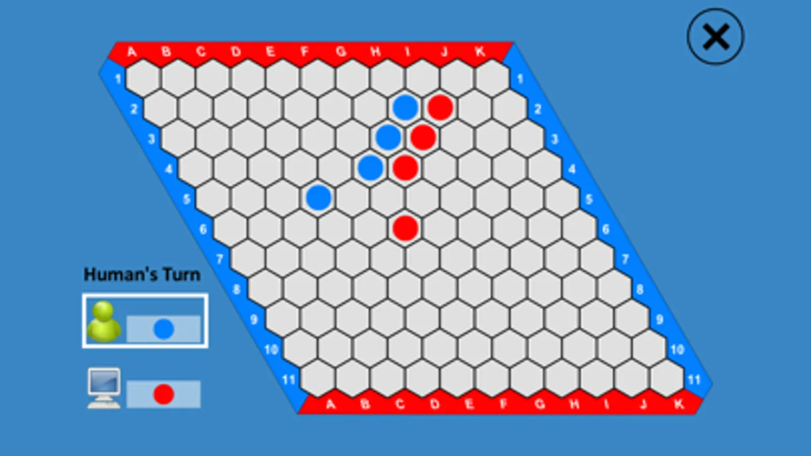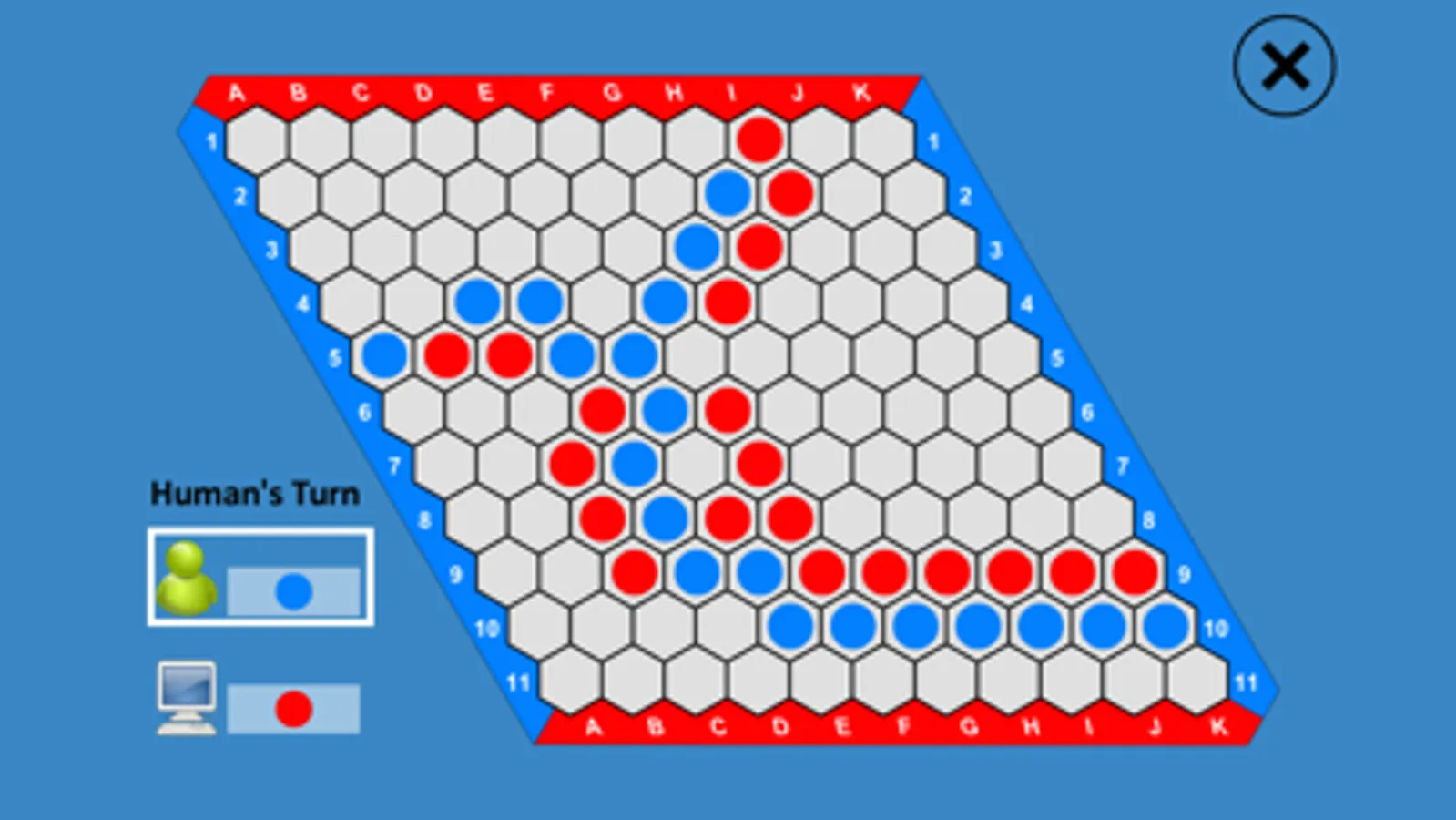 The red player trys to connect the two red borders with a chain of red cells by coloring empty cells red,
