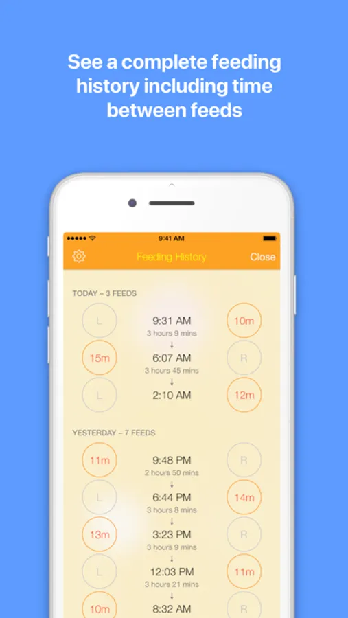 Feeding history screen shows how long you have fed your baby, including time between feeds. Also, it tells you how old your baby is on that day.