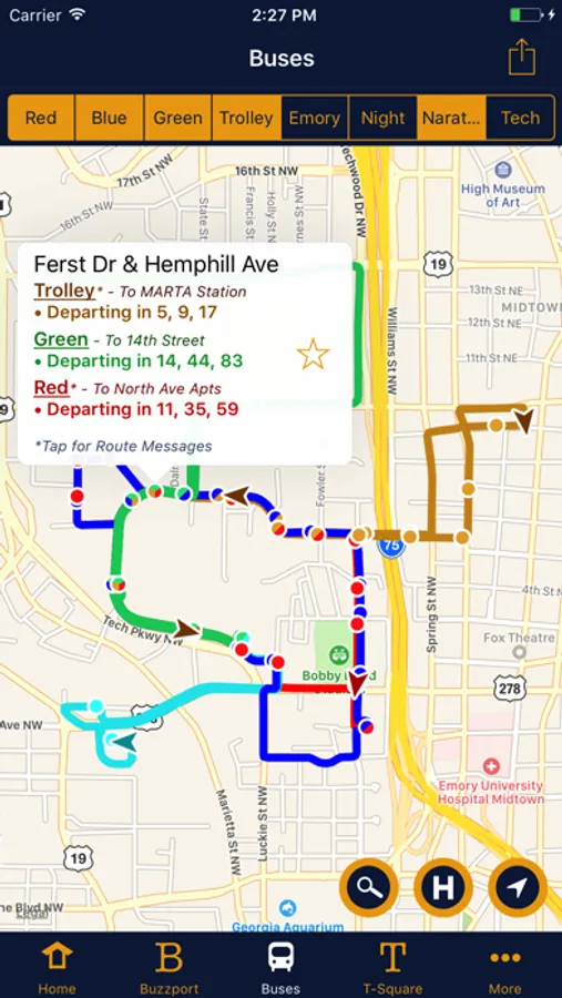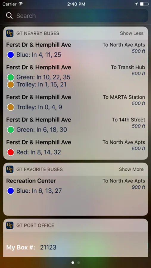 -Widgets, allowing you to instantly view your post office information and GT ID and to see the arrival times of nearby buses and arrival times at your favorite stops.