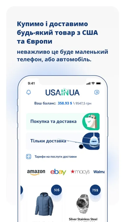 Відкрийте для себе світ захоплюючого шопінгу в США і швидку, безпечну доставку в Україну. Встановіть безкоштовний застосунок USAinUA і отримаєте знижку на перше замовлення.