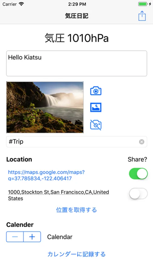 iPhone内蔵の気圧センサーを使って、Twitter、Facebook、Instagramなどソーシャルメディアやメッセージで共有したり、カレンダーアプリに記録できるアプリです。