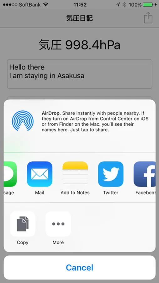 5. 右上のシェアボタンをタップすると、気圧やコメントをTwitterなどのSNS、メッセージやメールでシェアできます。