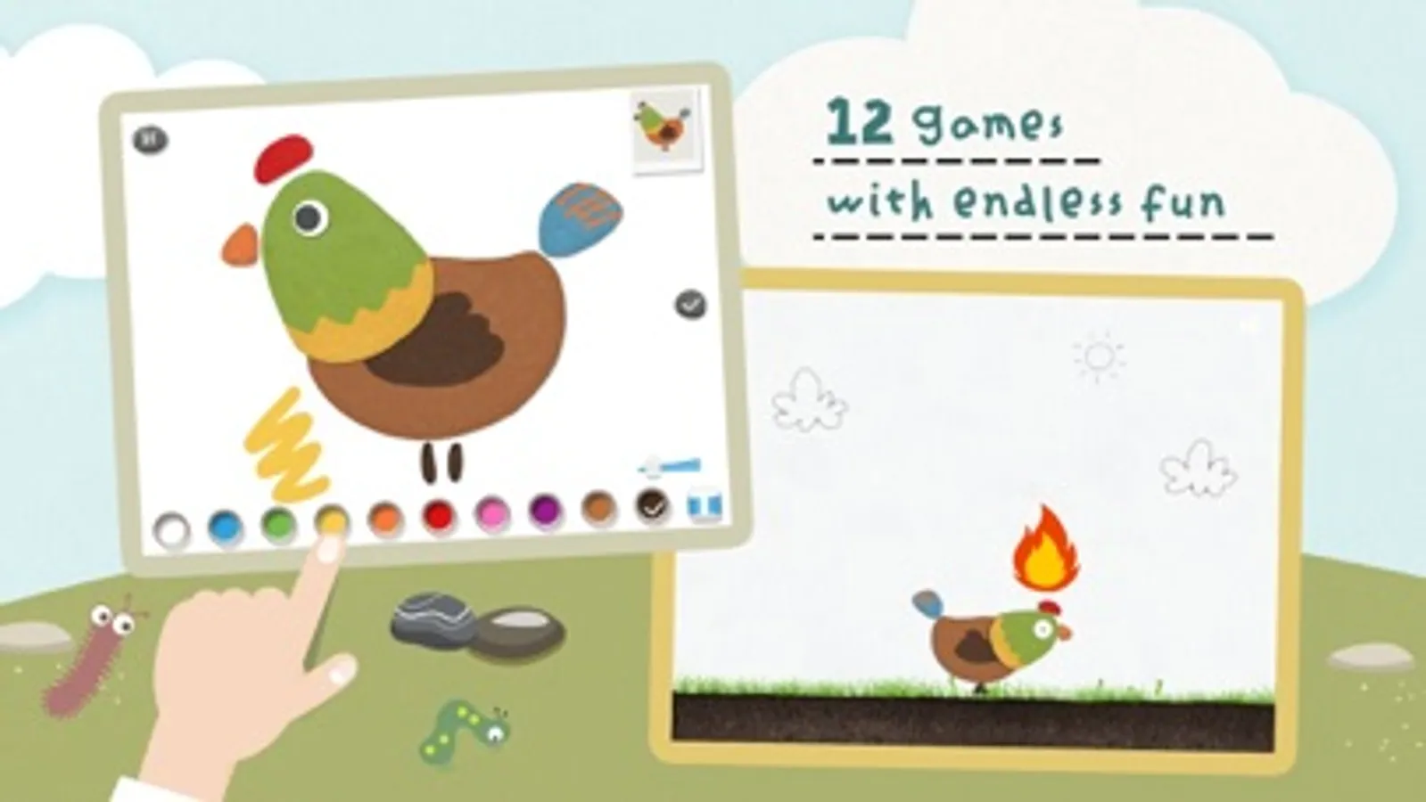 4. 12 games & activities: match insects, feed birds, peck insects, smack rabbits, beach run, gesture memory, music rhythm game,stone men choir etc ...;