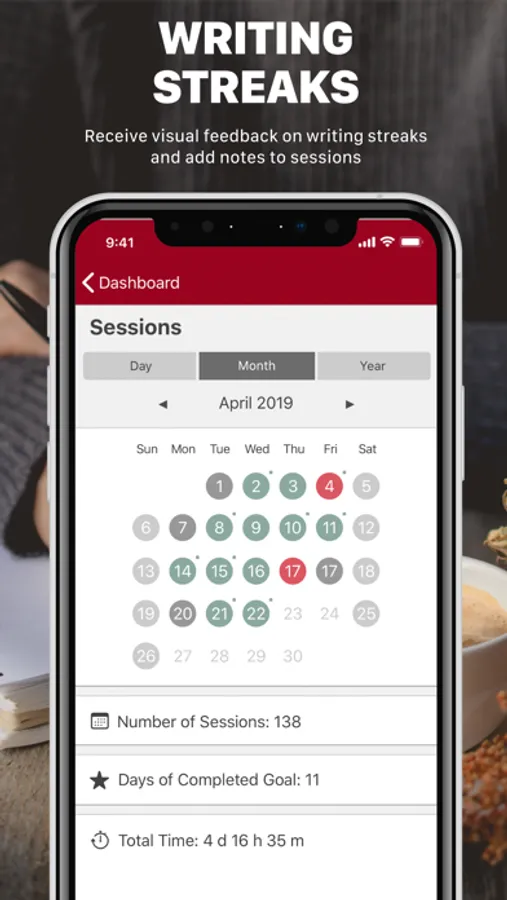 Keep notes for each session. See your writing speed and location, time and hours, and your word count.