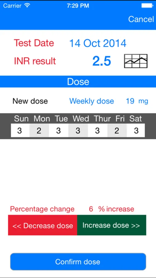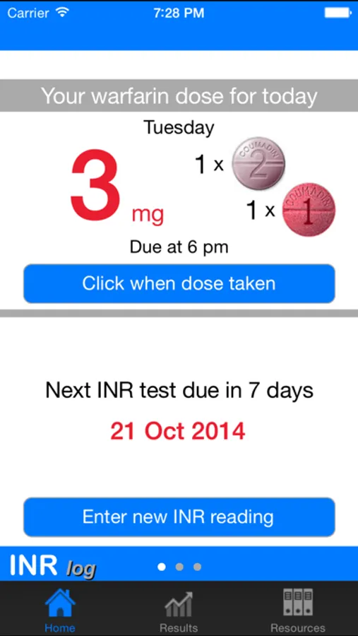 It is easy to use and allows you to record all your INR results and your treatment prescribed by your doctor. Each day it will show you your warfarin dose and sends you an alert when your treatment is due. It will also remind you when to take your next INR test to help you achieve the best possible control.