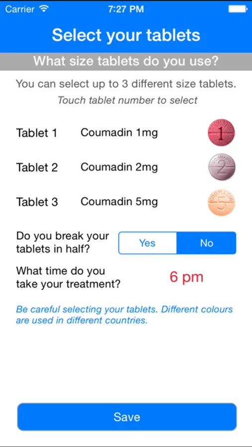 It is very flexible and allows you to enter your own treatment range and select up to 3 different size tablets. You can record your dose as a daily dose or weekly dose and change the dose very easily based on your doctor's advice.