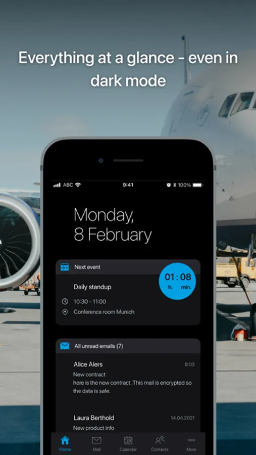 Choose yourself which information you’d like to see immediately when starting the app, e.g., unread emails, upcoming events and the time left until the next meeting