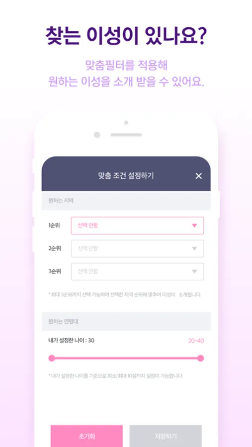 나이, 지역, 거리 등 소개받고 싶은 이성의 조건을 적용해 보세요.
